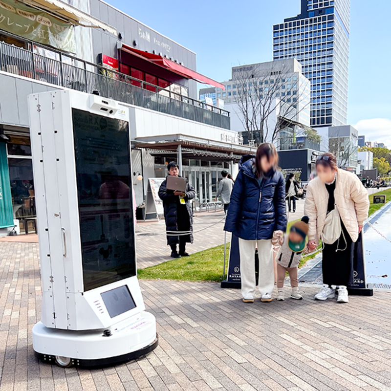 もっと見る名古屋国際工科専門職大学の学生がプログラミングしたロボットKebbi Airで、名古屋の街のご案内やHisaya-odori Parkの店舗紹介をする実証実験が行われました。観光客の多い立地に合わせ、街について知るクイズを開発するなどの工夫が盛り込まれ、ご来園者を楽しませていました。当日の会場はとても風が強く、ロボットもご来園者も互いの会話が風切り音でかき消されるなど、屋外ならではのハプニングもありましたが、声の代わりに画面をタッチするなど、ロボットの身体性を生かして意思を伝え合っていました。今後は複数の言語で対応できるコンテンツも実証してみたい、と次のチャレンジに意欲を燃やしていました。(2024年3月)